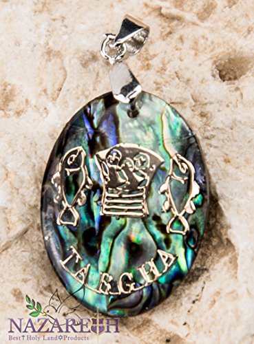 - Beautiful Abalone Shell Pendant Golden Tabgha Jesus Fish Illustration Handmade Clear Coating Over The Whole Pendant So the Emblem Won't be Caught on Anything or similar Circumstance. From Nazareth Fit on every Necklace Original Item From Holy Land.